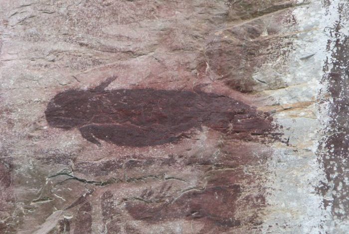 I’ve never heard of there being a drawing of a mermaid, I assume the writer has misread dugong (an animal which is depicted, see photo) for duyung (mermaid). Also I’m not sure if there really is a drawing of a fawn inside the mother. The researchers have classified the X-ray drawing as being a mountain goat, as it is quite different from the paintings of deer.