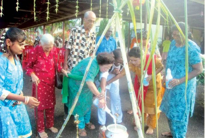 Pongal is the Tamil Harvest Festival. The event began with the ‘silver pot’ (replacing the earthen pot) placed over a small wood fire pit, a ritual to mark Pongal. The boiling of the milk until it overflows is done as a form of thanksgiving to God for a bountiful harvest and healthy crops. Rice grains, sugar and other condiments were added into the pot for the cooking of pongal soru (sweetened rice). When it was overflowing, all present took turns to pray and helped themselves to this delicacy.