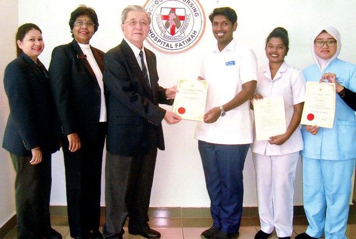 Dato’ Chan Yew Mun, chairman of the institution, presented the certificates to Sabrina Casandra A/P Thomas, a self-sponsored student who will be joining the National University Hospital in Singapore and Gerald Ben A/L Gilbert Martin Ben, a Hospital Fatimah sponsored student, who is already employed with the hospital. Another Hospital Fatimah sponsored student, Ruhaidah Binti Rosli was selected to be in the Chairman’s list for the school’s final examination.