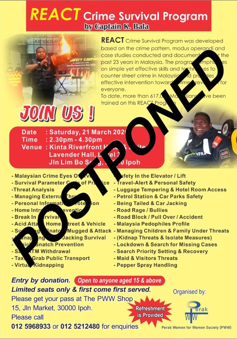 Home/Happenings/Events/POSTPONED: REACT Crime Survival Programme (21 Mar 2020) EventsHappenings POSTPONED: REACT Crime Survival Programme (21 Mar 2020) vwsl Send an email 13/02/20200 1,312 Less than a minute Facebook X WhatsApp Tagscrime prevention perak women for women pww vwsl Send an email 13/02/20200 1,312 Less than a minute Facebook X WhatsApp Show More Share Facebook X WhatsApp