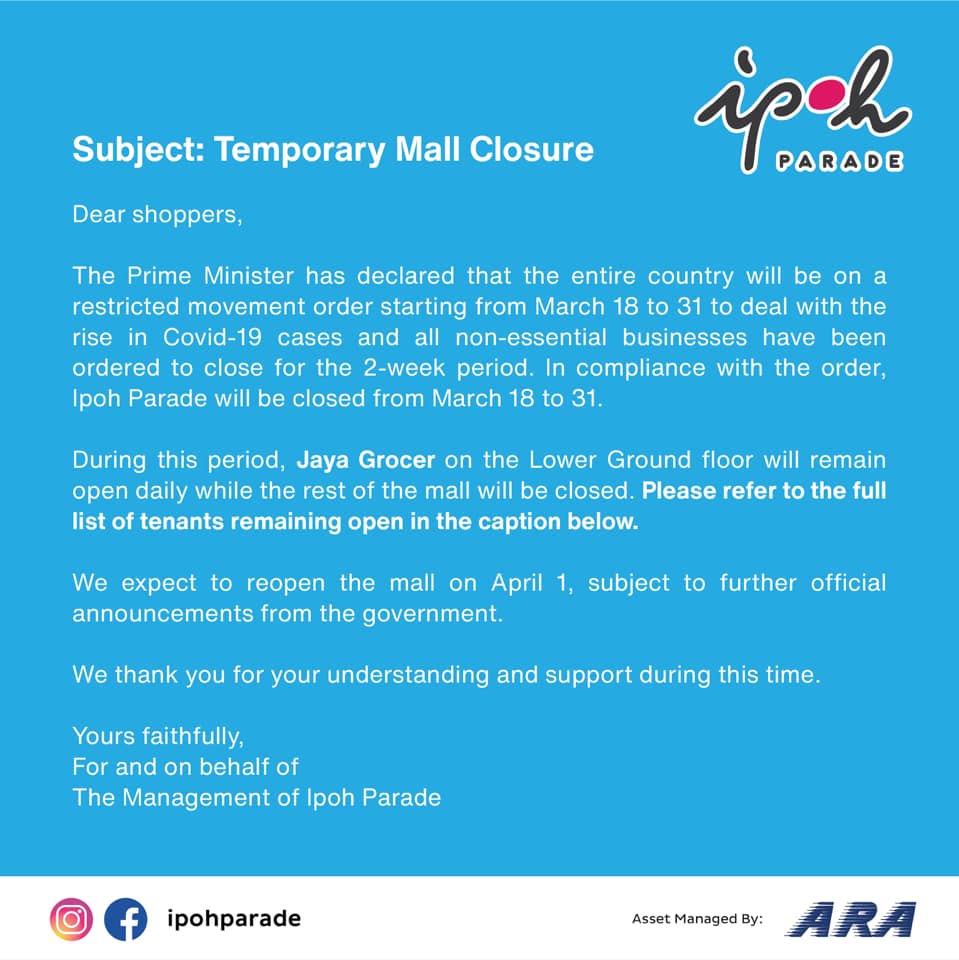 Following the Prime Minister’s announcement to implement the Movement Control Order nationwide in dealing with the rise in Covid-19 cases and that all non-essential businesses are ordered to be closed from March 18-31, Ipoh Parade will halt its operation during this 2-week period to comply with the order.