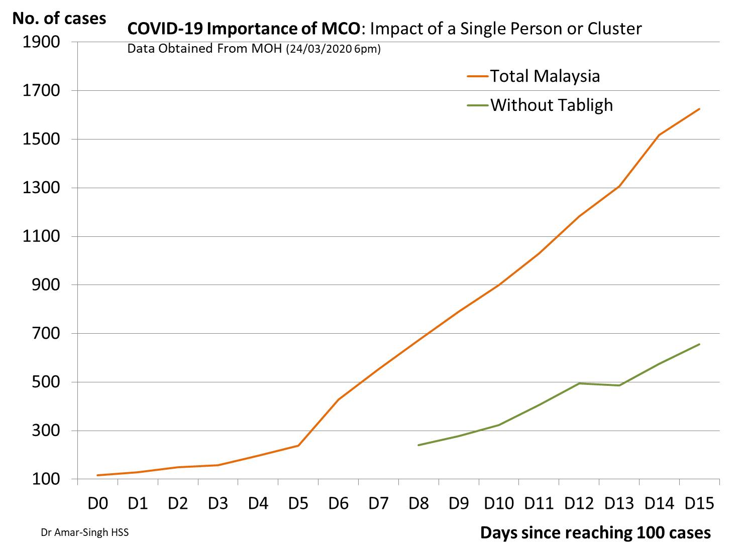 Every Malaysian has a part to play here. If even a small portion of our community (10%) disregards the MCO, then we will be in crisis. As an example, see the graph below that shows the impact of just one person or one group on the entire pandemic in Malaysia. This is not to blame any individual or group but show us how each of us can make a significant difference in stopping this pandemic or inflaming it. The infection introduced into the tabligh convention accounts for more than half our national outbreak and continues to have ramifications in our country and is a super-spreading event for many neighbouring countries.