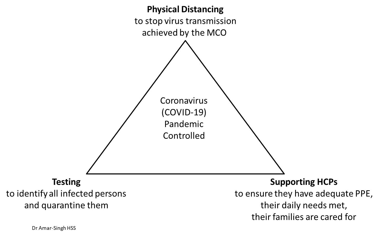 There are three things that we need to emphasise, that would enable us to move forward. Three corners or points of a triangle that are critical for us to endure this period and deal with this pandemic (see the figure). If even one is broken, we will not be able to halt the pandemic.