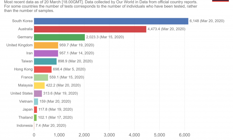 The second arm of our defence is testing. We need to identify all infected persons and quarantine them. I have spoken earlier about this but would like to highlight a little more on what is happening currently. The graph below shows the ‘test returns’ and ‘positivity rates’ each day for COVID-19, based on the calculation on data obtained from MOH press releases. I am indebted to two Malaysians I have met online during this pandemic for thinking through this data with me and offering valuable insights (they have chosen to remain anonymous). The data is limited by the very large number of pending tests and we have no idea of private testing numbers. But the high positivity each day (10-20%) indicates that we are still doing too few tests. You have to cast your net widely to pick up cases when the pandemic is spreading in the community (see my earlier article). Note in contrast that only ~3% of South Korea’s coronavirus tests result in confirmed cases, ~1% in Australia but ~16% in Italy. The higher the positivity the weaker the testing strategy. The testing per million population graph from “Our World in Data” group also shows where we fare compared to others (caution that some data is older and countries may have improved).