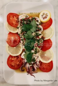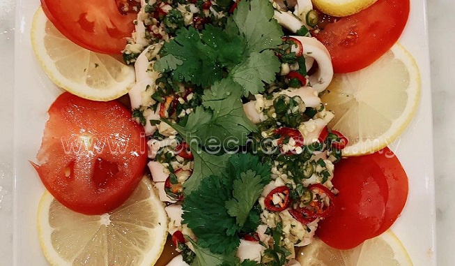 - Once the squid is steamed, arrange on a plate, then pour the prepared sauce over the squid.
