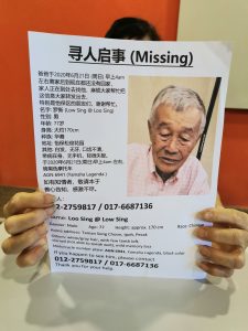 If you have seen the missing elderly or have related information, do report it to the nearest police station or call Loo Kam Lan at 017-6687136.
