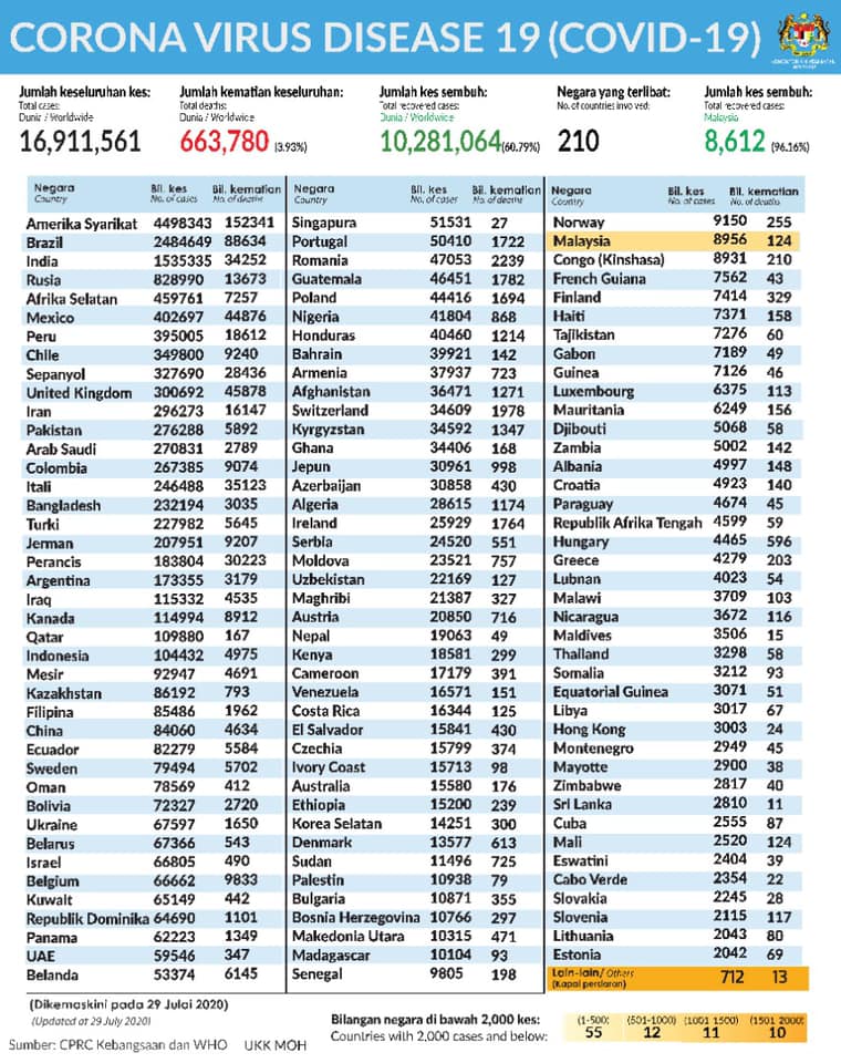 According to a report from the Ministry of Health (MOH) Malaysia, some 253,000 confirmed worldwide daily COVID-19 cases were recorded latest today on July 30. This was an increase compared to yesterday (July 29) at just 223,000 cases, bringing the cumulative cases to nearly 17 million, at 16,911,561 cases.