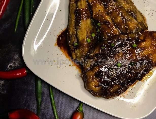 - Heat oil in a pan, then fry both sides of the eggplant until golden brown. Dish out and keep aside.