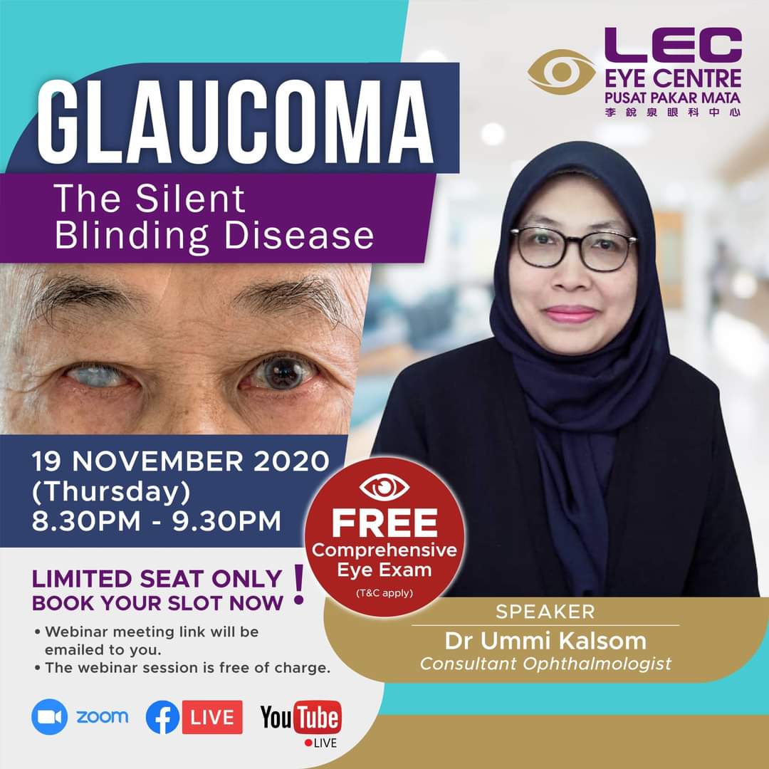 LEC Eye Centre will be hosting their upcoming 5th series webinar by Dr. Ummi Kalsom on 19 November 2020 (Thursday). The topic is Glaucoma – The Silent Blinding Diseases. Glaucoma is a group of eye conditions that damage the optic nerves. This damage is often caused by an abnormally high pressure in the eye and is irreversible.