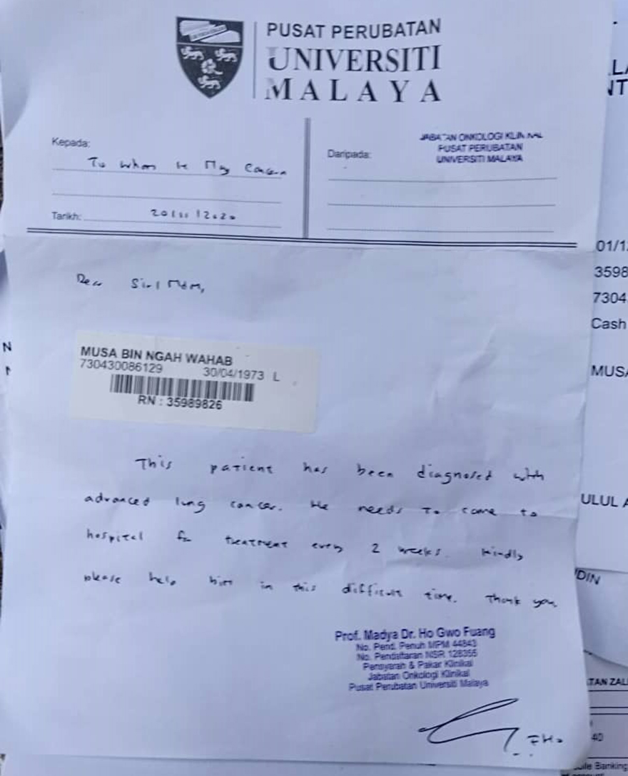 “He was diagnosed with lung cancer earlier this year. RM40,000 is needed for further treatment at Universiti Malaya Medical Centre (PPUM).