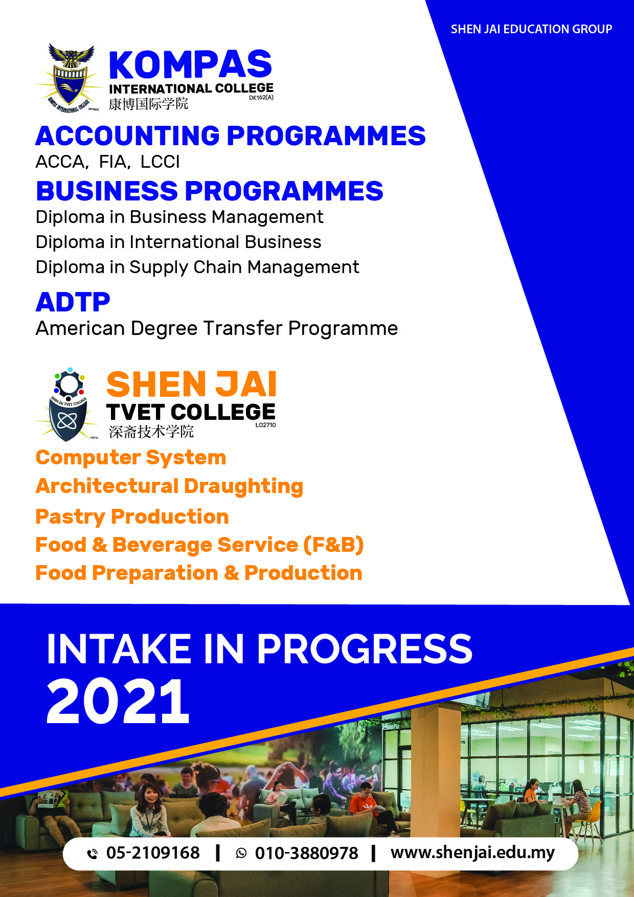 Kompas International College (KIC) and Shen Jai TVET College (SJTC) are two institutions under Shen Jai Education Group (SJEG). Both colleges are located at Ipoh Garden Square. KIC offers academic programmes ranging from Diploma to Masters level while SJTC offers various technical courses such as hospitality and technology. For further information, go to our website at www.shenjai.edu.my or call us at 05-2109168 or Whatsapp 010-3880978. You can also go to our FB Page – Shen Jai Education Group.