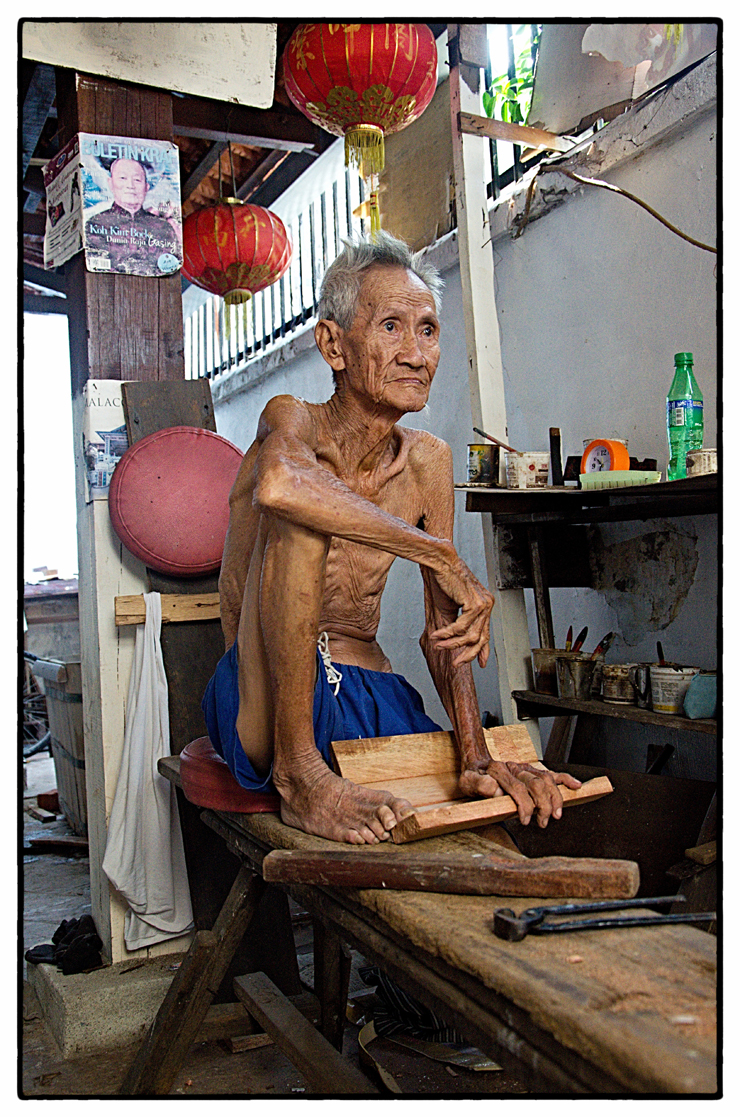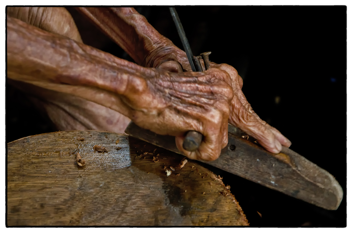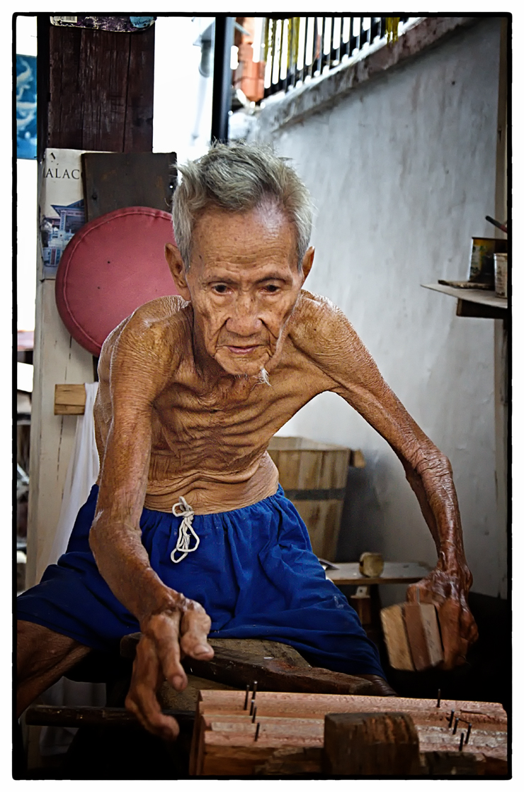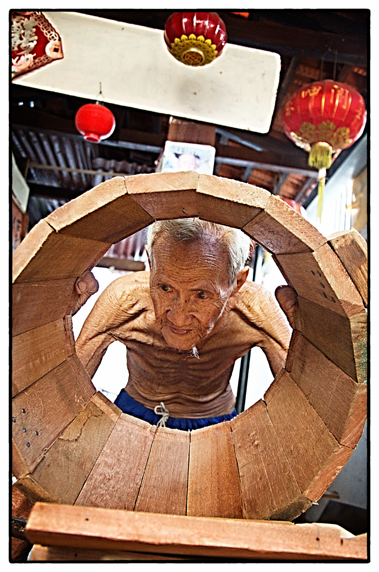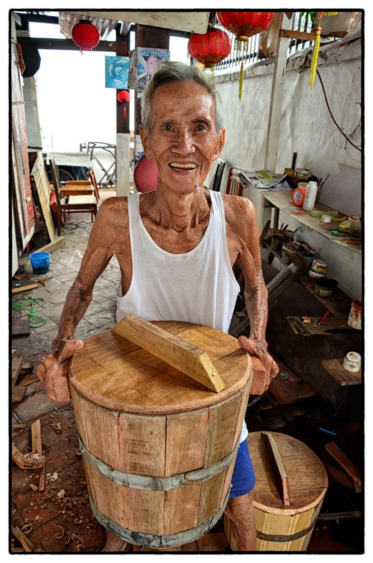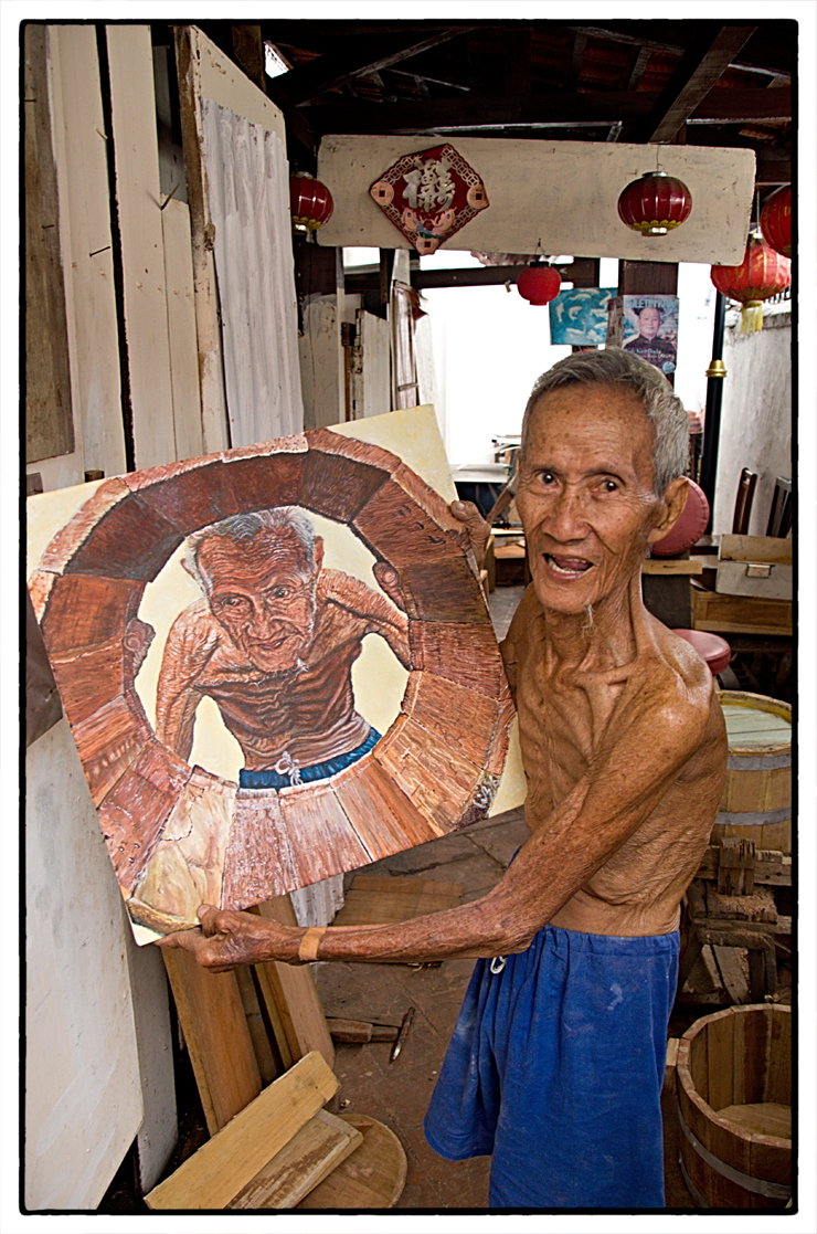 I immortalized his work, dedication, smile with the camera. My wife painted him and her canvas was purchased by an American couple. He also appeared, towards the end of his life, in a Singapore documentary. He passed away recently and the Art of wood bucket-making disappeared with him. You have my sincere admiration and respect, Mr Chan, wherever you are now.