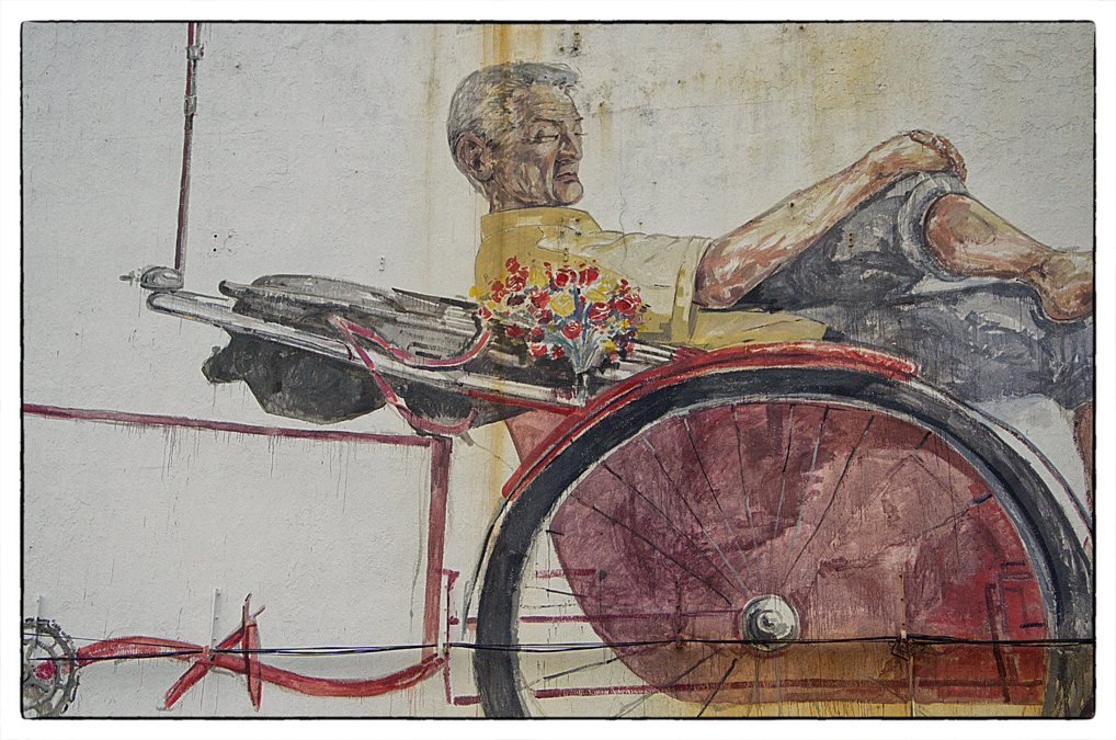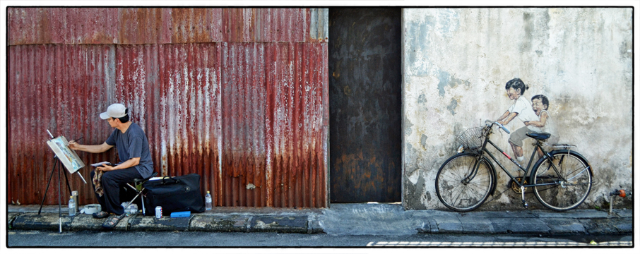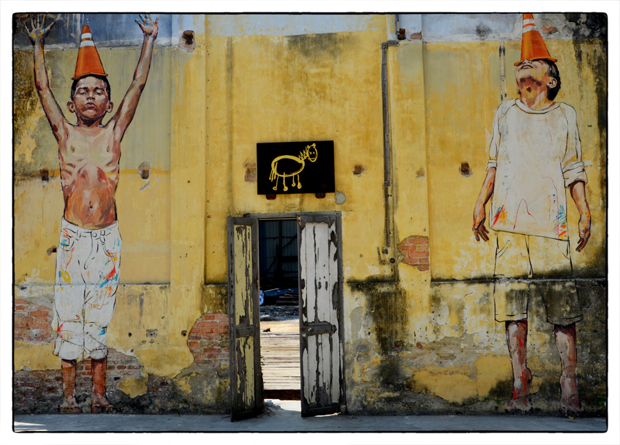 Aside from that, street art also contributed to the tourist boom. An Art Challenge was organised by the State Government in 2009 called the “Marking of George Town”. It was won by “Sculpture at Work” with 52 steel rod caricatures called “Voices from the People” which had designs to reflect the character of George Town. The George Town Festival 2012 commissioned Ernest Zacharevic from Lithuania (only 35 years old today) for the “Mirrors George Town” project. It had some innovative exhibits together with several large scale murals. Ernest and his companion at the time came several times to our place. Today he is a world famous artist.