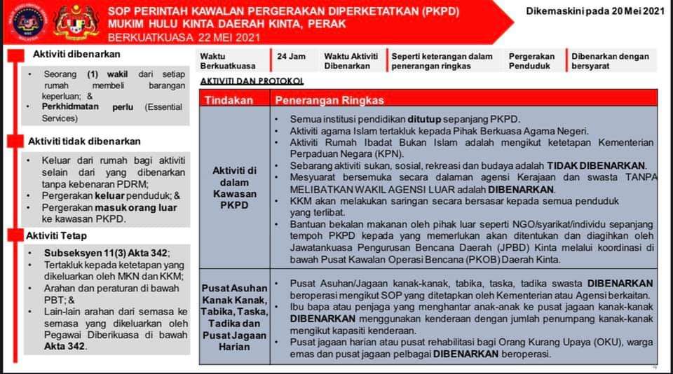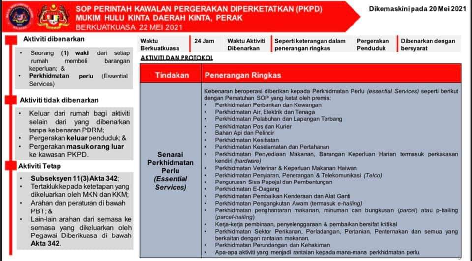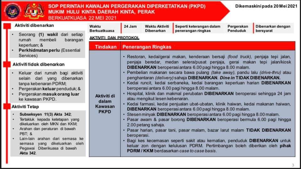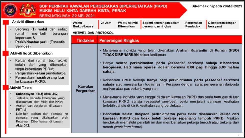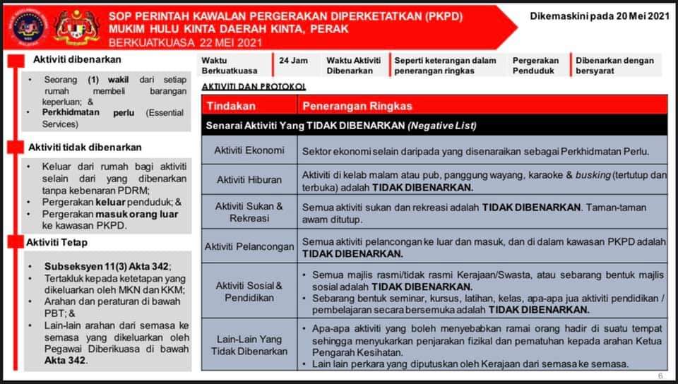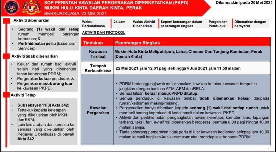The following is the list of standard operating procedures (SOPs) for the Hulu Kinta subdistrict (mukim) covering Ipoh, Lahat, Chemor and Tanjung Rambutan which is placed under the Enhanced Movement Control Order (EMCO) effective 12.01am of May 22 till 11.59pm of June 4.