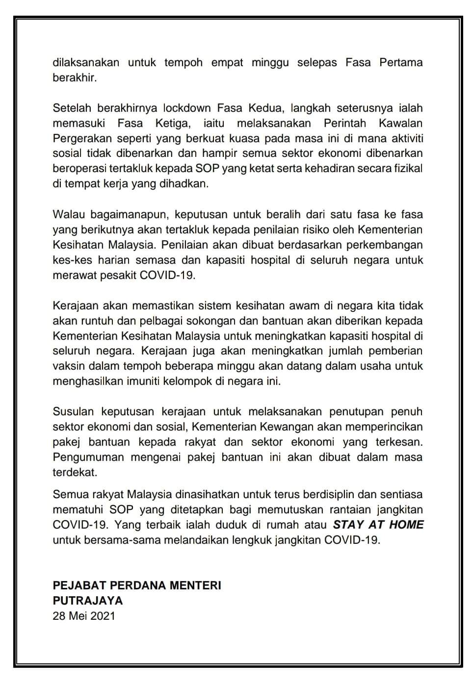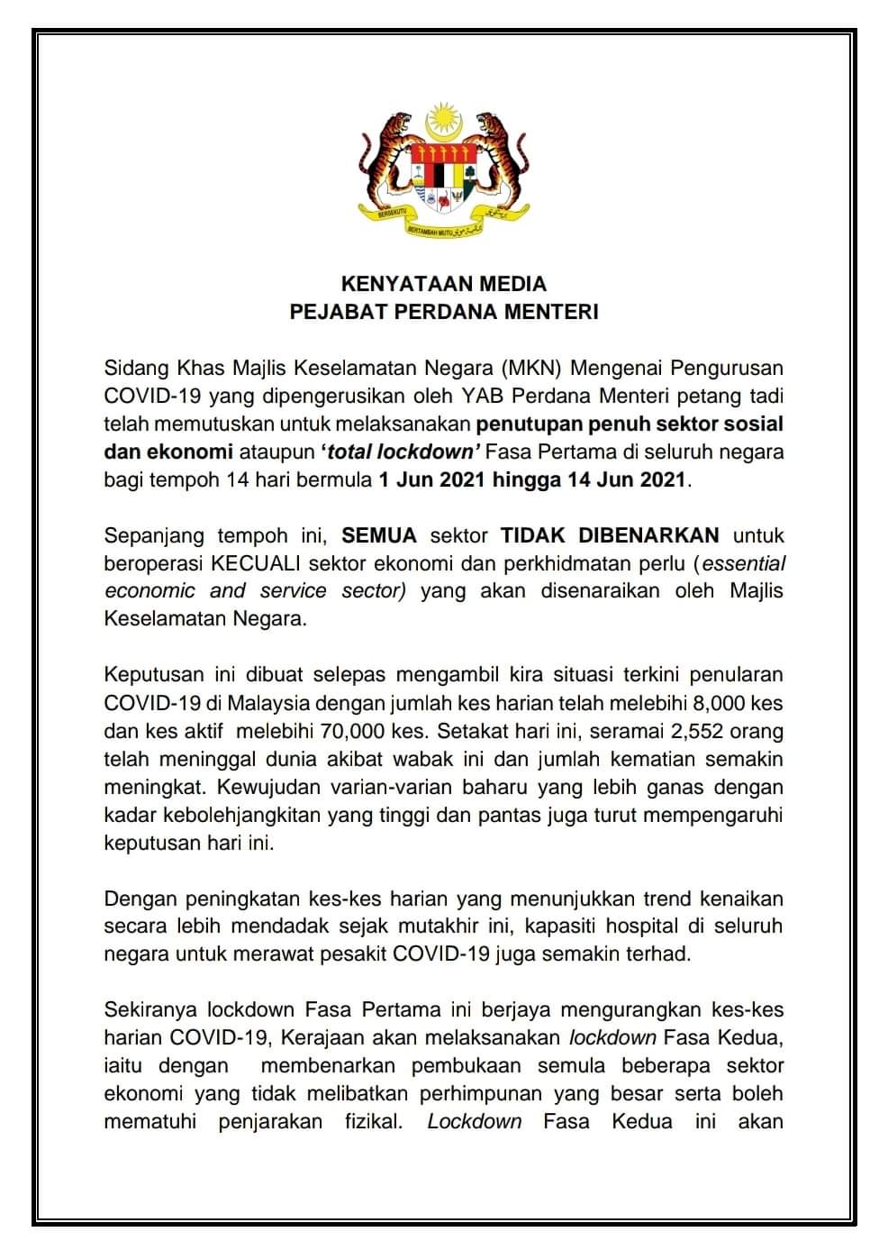 According to the media statement released by the Prime Minister’s Office today (May 28), the decision was made in view of the current situation of the COVID-19 outbreak in Malaysia with the total daily cases exceeding 8,000 cases and active cases exceeding 70,000 cases. Till today, a total of 2,552 people died from COVID-19 and the number is increasing. The emergence of new variants that are more aggressive and infectious also contributed to the decision.