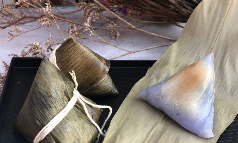 - Place two bamboo leaves on top of each other with the smooth side up and fold the top end diagonally into a cup shape to form a cone.