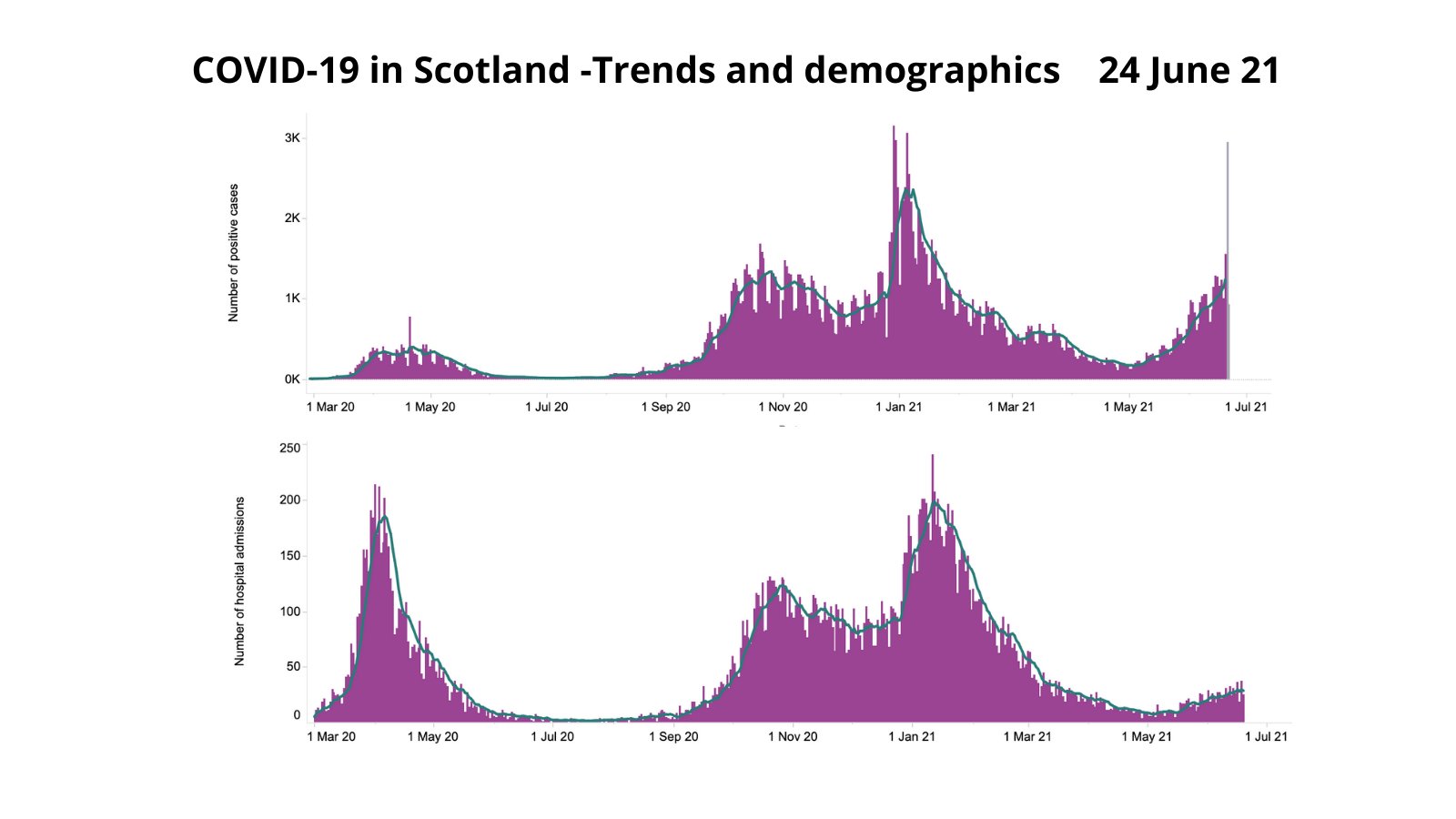 Note that even nations with high vaccination rates are beginning to see a rise in cases and hospitalisations due to the Delta variant. Current data from Scotland (see figure below) from Dr Gabriel Scally (@GabrielScally), former Regional Director of Public Health England and a member of Independent Sage, shows that despite 48% of the population fully vaccinated, the Delta variant has caused a rise in cases and hospital admissions. While the majority who get infected are not yet vaccinated (showing good vaccine benefit), some vaccinated individuals also do get infected.