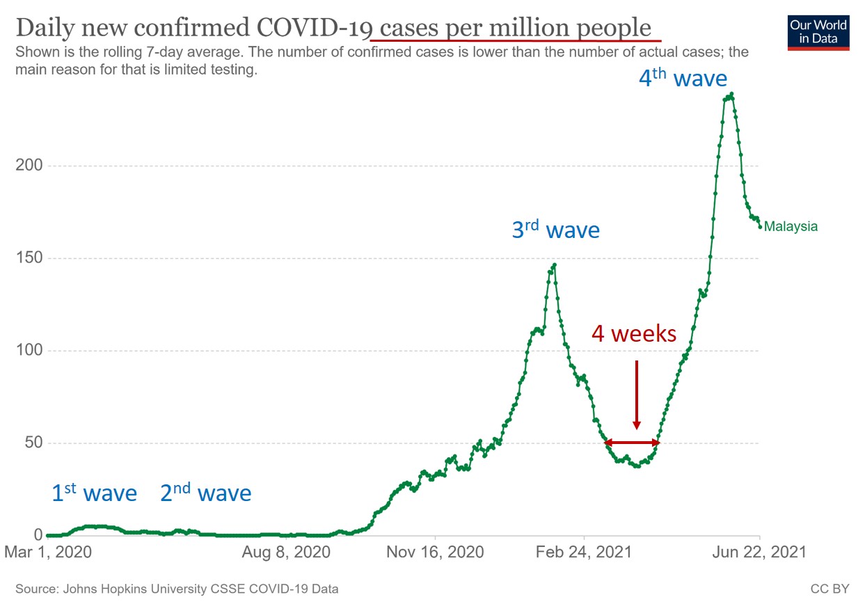 You can see that the 4th wave came very quickly after the 3rd wave; as fast as four weeks after the 3rd wave. Some may argue that the 4th wave was due to considerable movement of individuals related to the Puasa and Hari Raya period; that this encouraged spread. But the real issue is that, even now, we fail to understand that there is no safe number to meet. All social interactions at work, education, religious or otherwise are easily exploited by this virus. The current high baseline community infections, predominantly unlinked, makes another surge very likely.