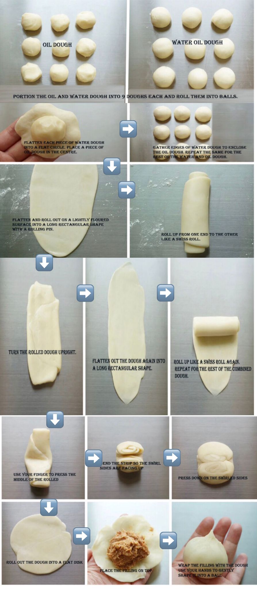 - Flatten the water-oil dough into a disc and place a ball of the oil dough in the centre. Wrap the water-oil dough around the oil dough and seal it tightly. Then, place the ball of dough aside and cover with damp cloth, ensuring that the opening of the dough is facing up. Repeat until all the dough is combined. Rest the dough for 10 minutes.