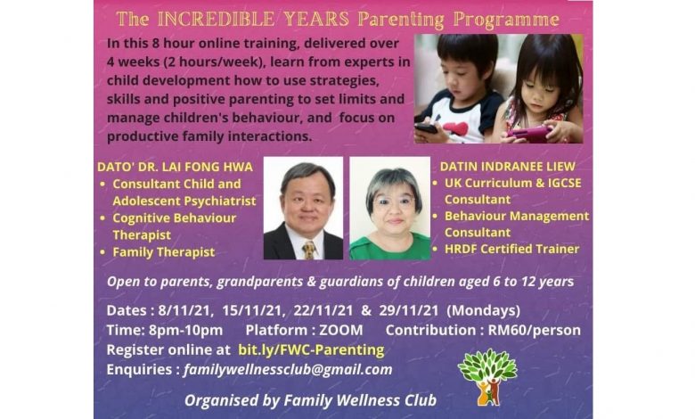 In the Family Wellness Club’s The INCREDIBLE YEARS Parenting Programme, two experts in child development will conduct an online parenting course of 8 hours, delivered over 4 weeks (2 hours/week), on how parents and guardians can set limits for young children and manage their behaviour, as well as focus on productive family interactions.