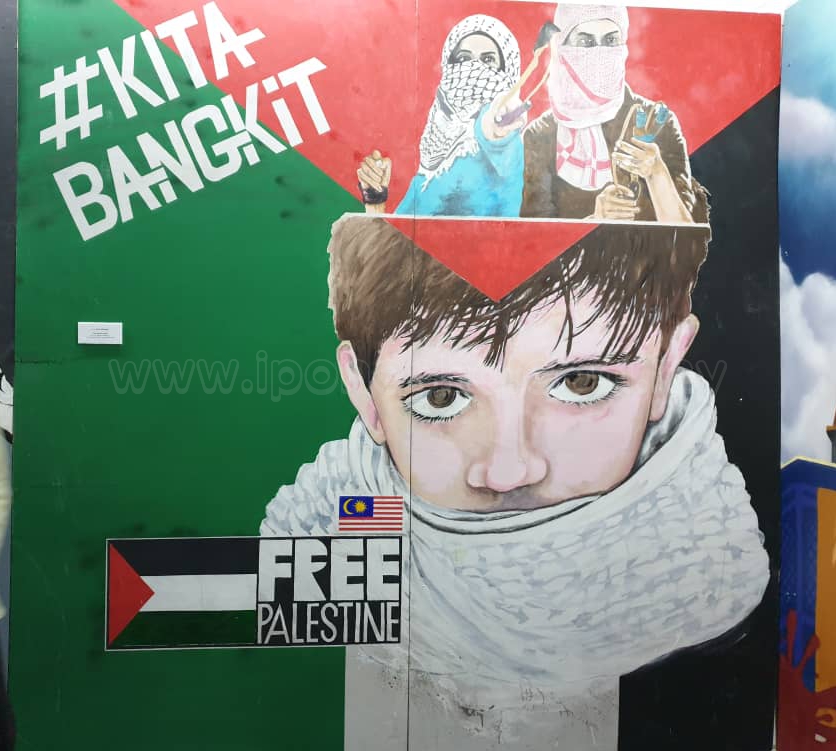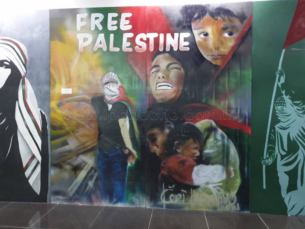 A mural painting of 24.38 metres in length attracts the attention of visitors to the Palestine Carnival which carries the theme ‘Antara Perjuangan & Air Mata’ (Of Fights & Tears).