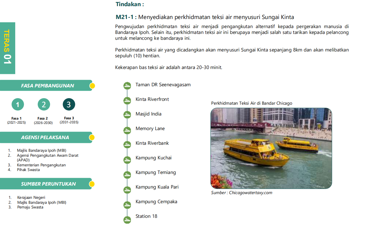 Another proposed alternative transport set to be a tourist attraction is water taxis along the Kinta River.