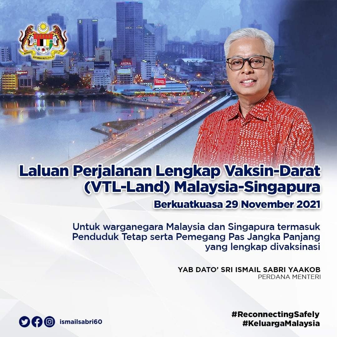 The Prime Minister’s Office announced today that the governments of Malaysia and Singapore are collaborating to launch the Vaccinated Travel Lane-Land (VTL-Land) on November 29, which coincides with the launch of the previously announced VTL-Air.