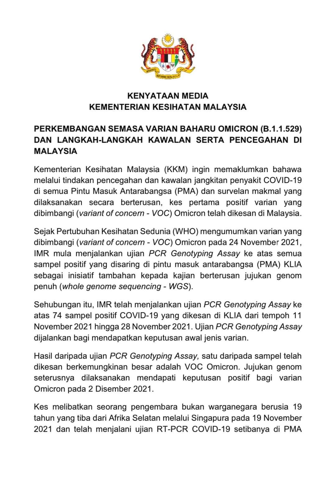 The Ministry of Health via a media statement on its official Facebook page today announced the detection of the first positive case of the variant of concern (VOC), Omicron, in Malaysia.