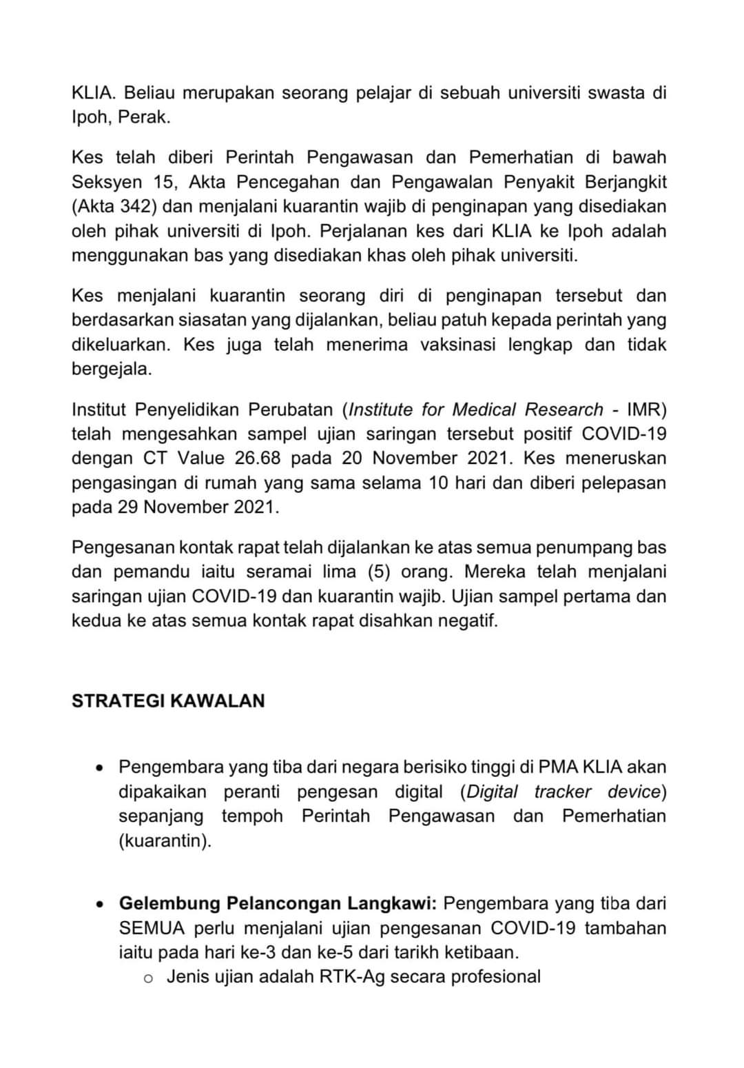 The case involved a 19-year-old non-Malaysian traveller arriving from South Africa via Singapore on November 19 and had undergone the RT-PCR test upon arrival at the international entry of KLIA. The case is a student of a private university in Ipoh.