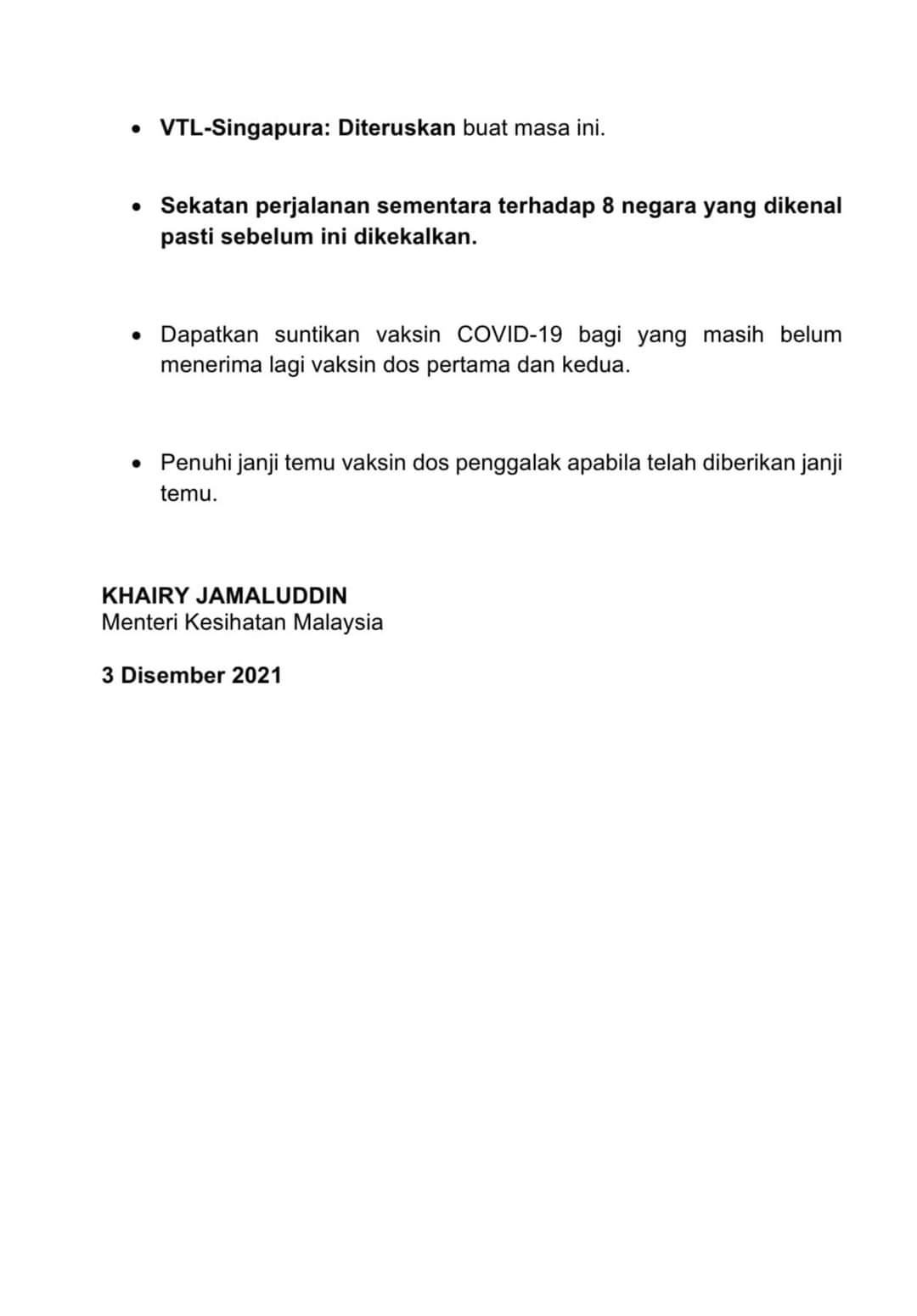 He also urged all to be measured in comments and reactions: “The Omicron case is a student, legitimately studying in Malaysia, coming back after visiting family in South Africa. The individual complied with pre-departure testing, on-arrival testing, is fully vaccinated and stayed home during quarantine.”