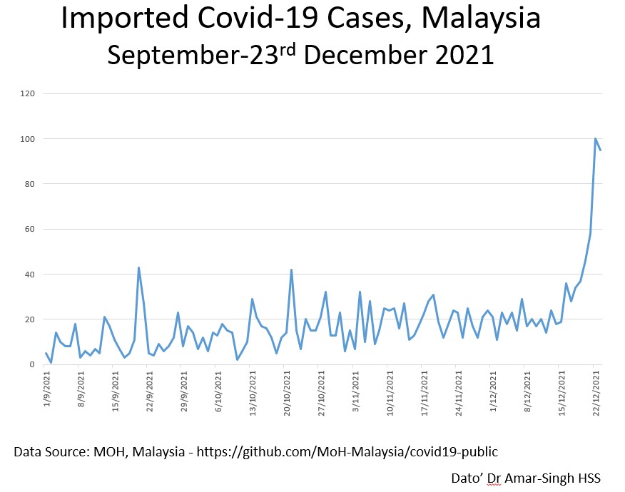 Our current Omicron detected cases in the country may appear low (2-3% of genome tests) but we must realise that our genome testing is very limited (0.25% of cases) compared to countries of our level of development (global GISAID database). If you look carefully at our data, you will see a steep rise in the number of infections in imported cases (see figure below). Most of these are probably the Omicron variant. It is very likely, as in many countries including Singapore, that Omicron is beginning to spread locally in the community.