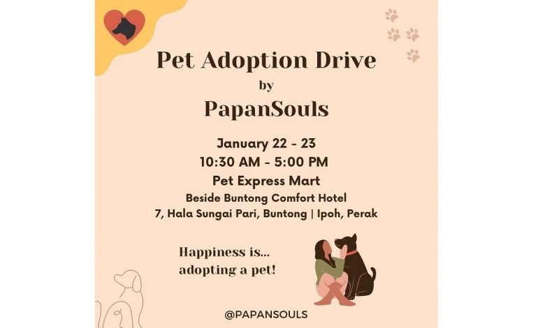 PapanSouls will be organising a pet adoption drive this weekend (January 22-23) at Pet Express Mart (beside Buntong Comfort Hotel) from 10.30am to 5pm.