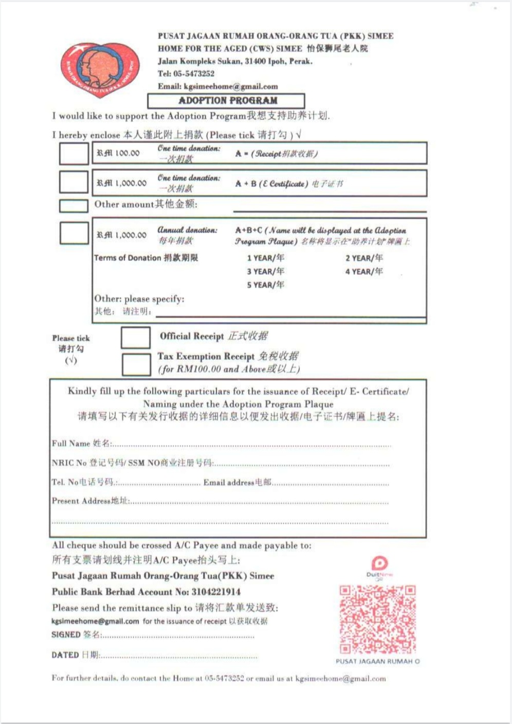 - Annual donation of RM1,000 or above – donor will receive an official receipt / tax exemption receipt, e-certificate and naming on the adoption programme plaque.