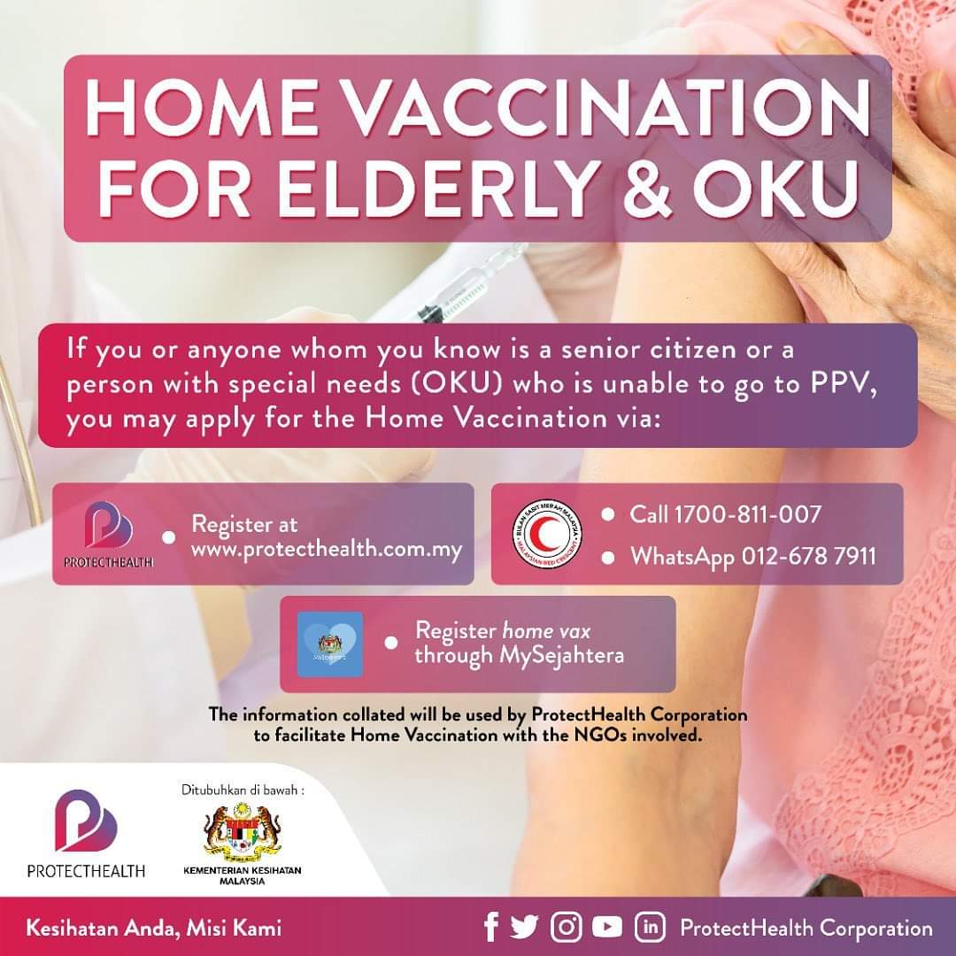 To ensure that no one is left behind, ProtectHealth is carrying out home vaccinations for the elderly population and the differently abled (OKU) in collaboration with health-related non-governmental organisations (NGOs).