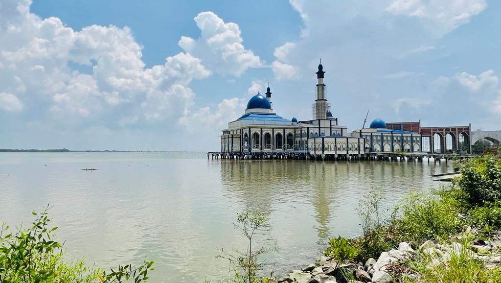 Across the river, there is a floating mosque under construction. The architectural features of the house of worship can be seen from afar. Its arched entryways is one most noticeable element apart from the vibrant blue colour of the dome of the mosque.