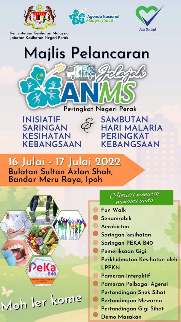 The state-level ANMS Tour will unfold from July 16 to 17 at the Sultan Azlan Shah Roundabout in Bandar Meru Raya, Ipoh with various activities for the public.