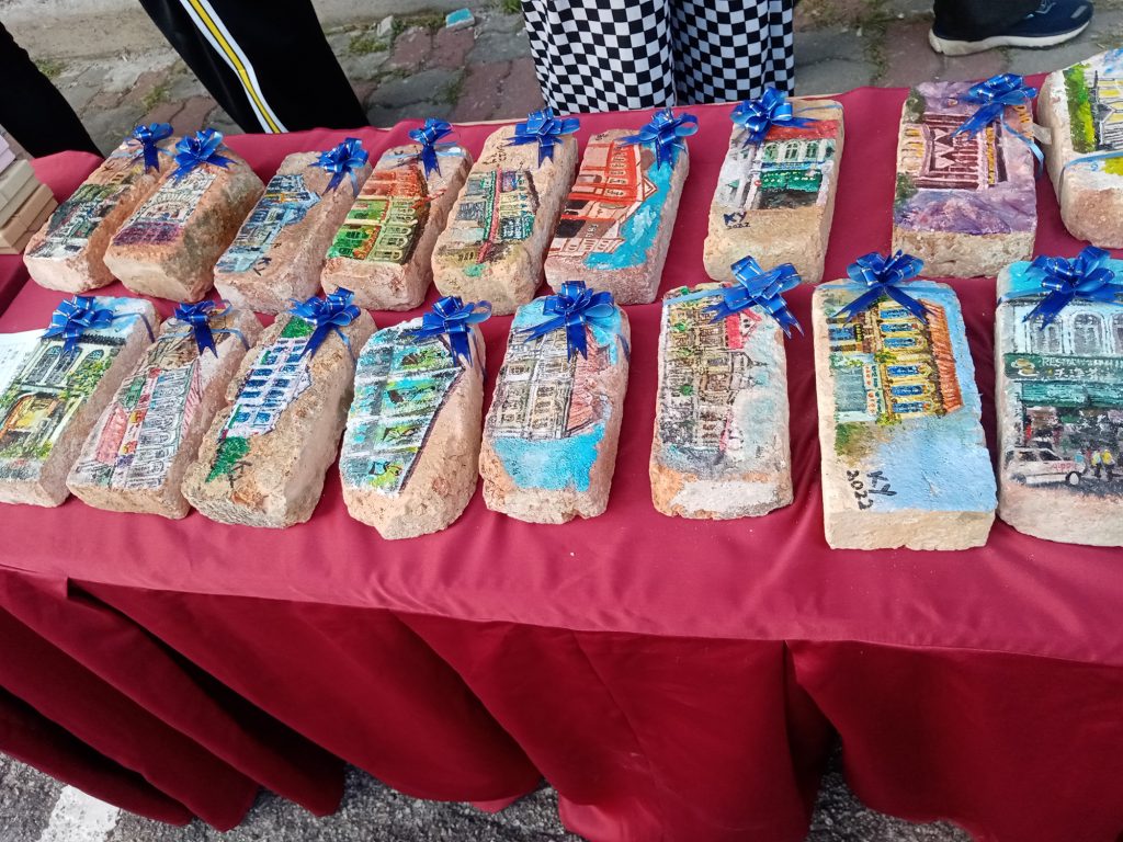 With the opening ceremony complete, visitors freely visited the many pieces of art within the walls of Tin Alley. Hung from racks, there was a huge myriad of art styles available for viewing. From more conventional and traditional art, like landscapes, still-life or simply the beauty of nature itself, to modern images like robots, anime characters from Jojo’s Bizarre Adventure and even some manga-style panel art. There were sketch portraits, contemporary graffiti art style paintings and even knitted fabric art. On top of that, there is the Brick Art wall, whereby each of the nearly century old bricks have been painted on and laid on the wall running along Tin Alley.