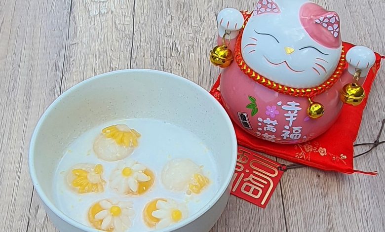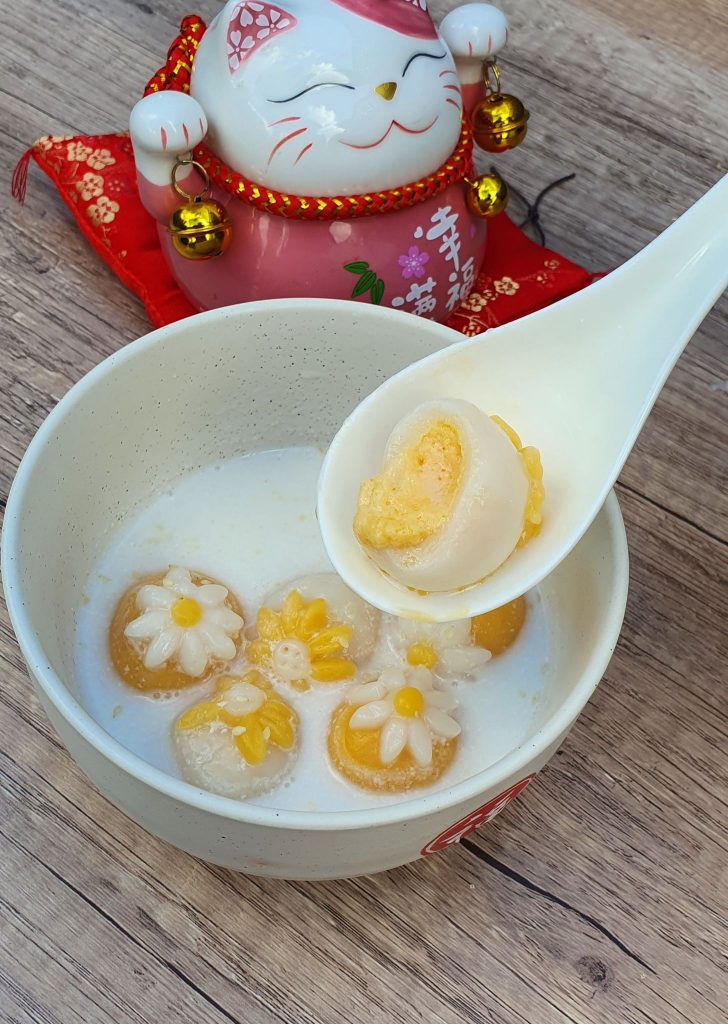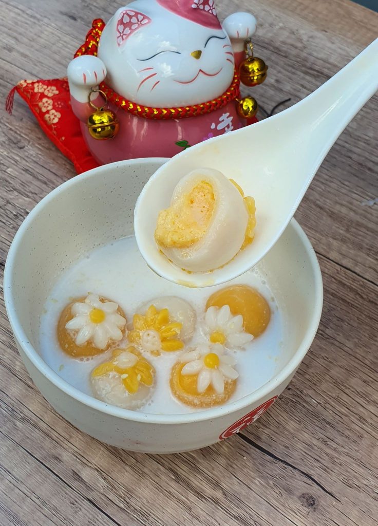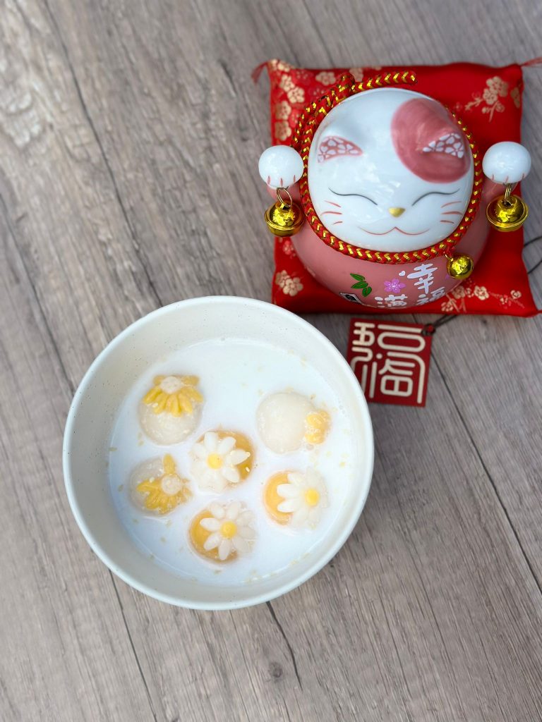 You can decorate your yuan tang with your favourite design. Always add water gradually, if the dough is too wet, add more glutinous flour, if the dough is too dry, add more water to knead until smooth.