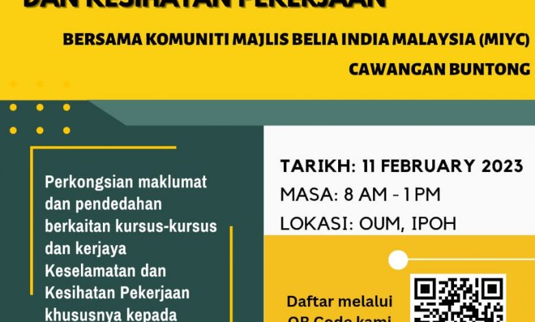 In collaboration with the National Institute of Occupational Safety and Health (NIOSH), the Malaysian Indian Youth Council (MIYC) Buntong are organising a Safety Competency and Occupational Health Programme, to be held at Open University Malaysia (OUM) Ipoh, on 11 Feb from 8 am to 1 pm.