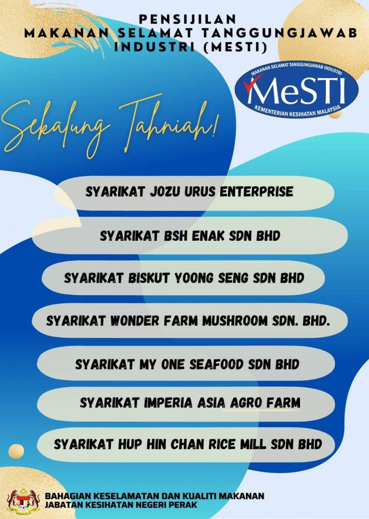 The Perak State Health Department congratulates the companies from the state of Perak that have successfully obtained the Food Safety is the Responsibility of the Industry (MeSTI) certification from the Ministry of Health Malaysia in 2022!