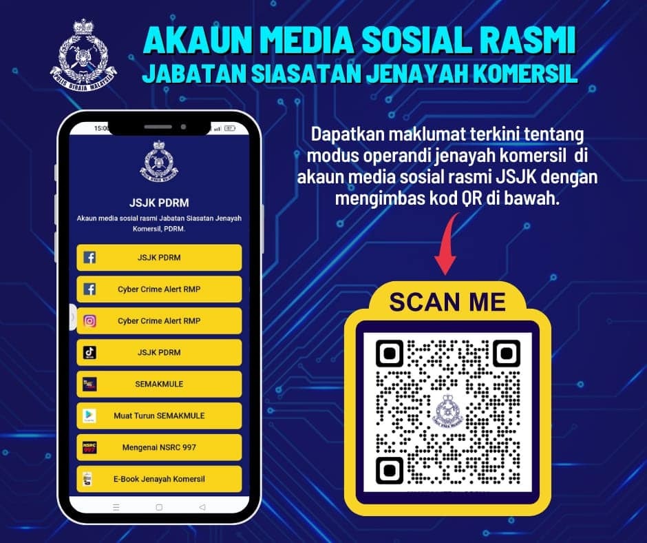 To all communities who want to get news about criminal activities on social media, especially scammers, please visit the official social media account of the Commercial Crime Investigation Department (JSJK) of the Royal Malaysian Police (PDRM).