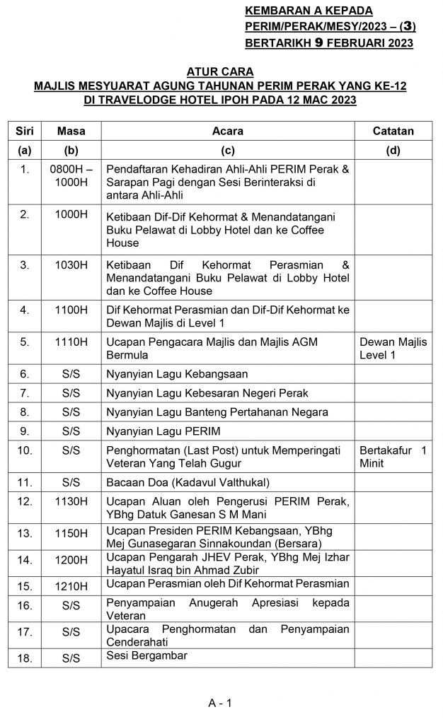 The Association of Malaysian Armed Forces Indian Veteran (Persatuan Veteren India Angkatan Tentera Malaysia (PERIM) Cawangan Perak) or PERIM for short, will be holding their 12th Annual General Meeting (AGM) on March 12 at the Ipoh Travelodge Hotel. The meeting will begin from 8 am and adjourn by 5.30 pm. Members are encouraged to attend. Further details in the agenda below.