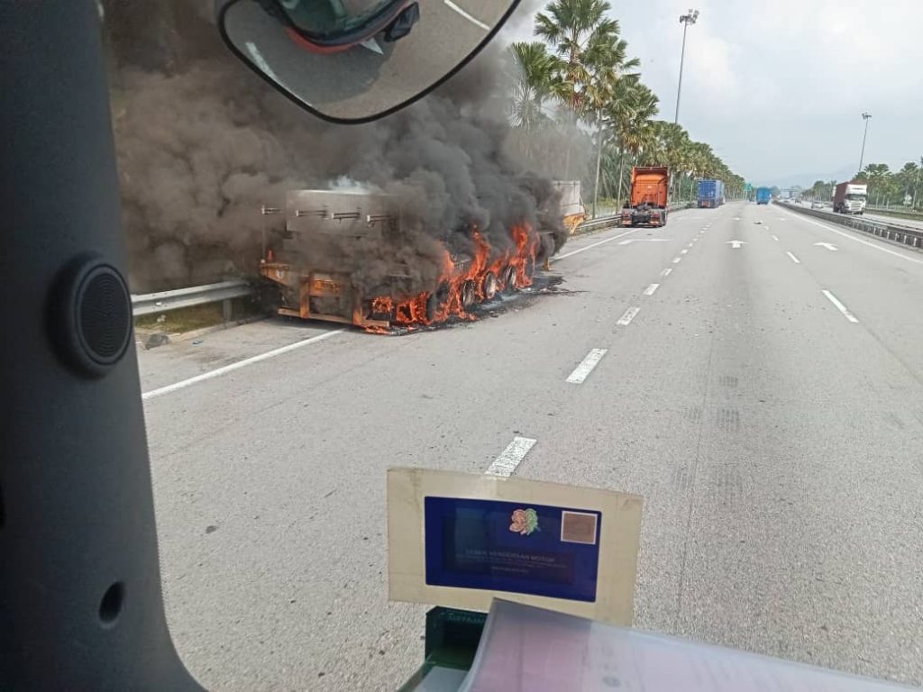 BAGAN SERAI: A trailer carrying a load of reinforced concrete was destroyed by fire in the entire tire section at Kilometer 181 of the North South Highway (PLUS), here today.