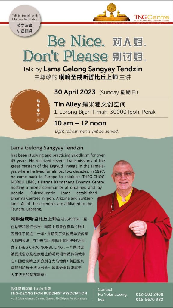 There will be a talk by Lama Gelong Sangyay Tendzin on April 30 at Tin Alley (1, Lorong Bijeh Timah, 30000, Ipoh, Perak) from 10 am to 12 noon, entitled “Be Nice. Don’t Please.” The talk will be in English with Chinese translation.