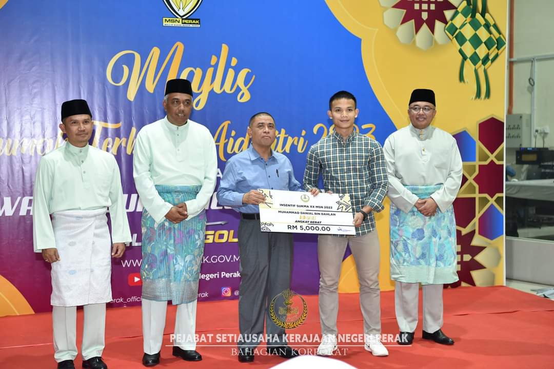 For the SUKMA 2022 victory incentive, the first recipient is weightlifter Muhammad Danial Dahlan who won the gold medal in the 67 kilograms (kg) category amounting to RM5,000.
