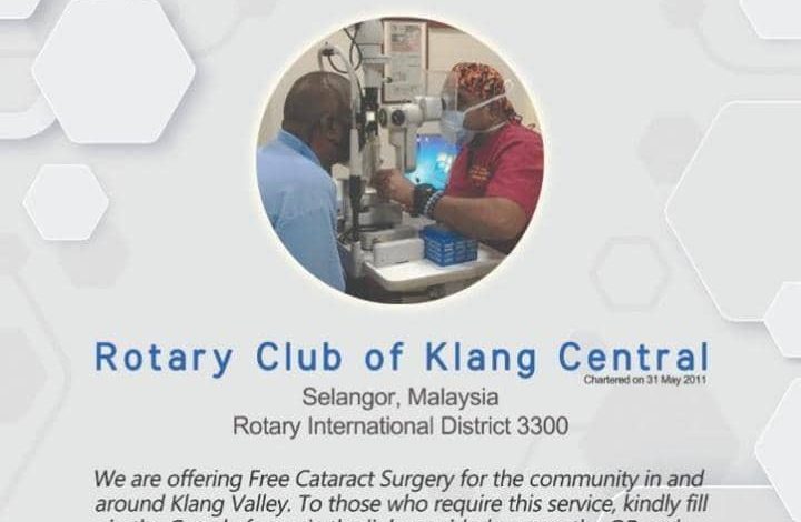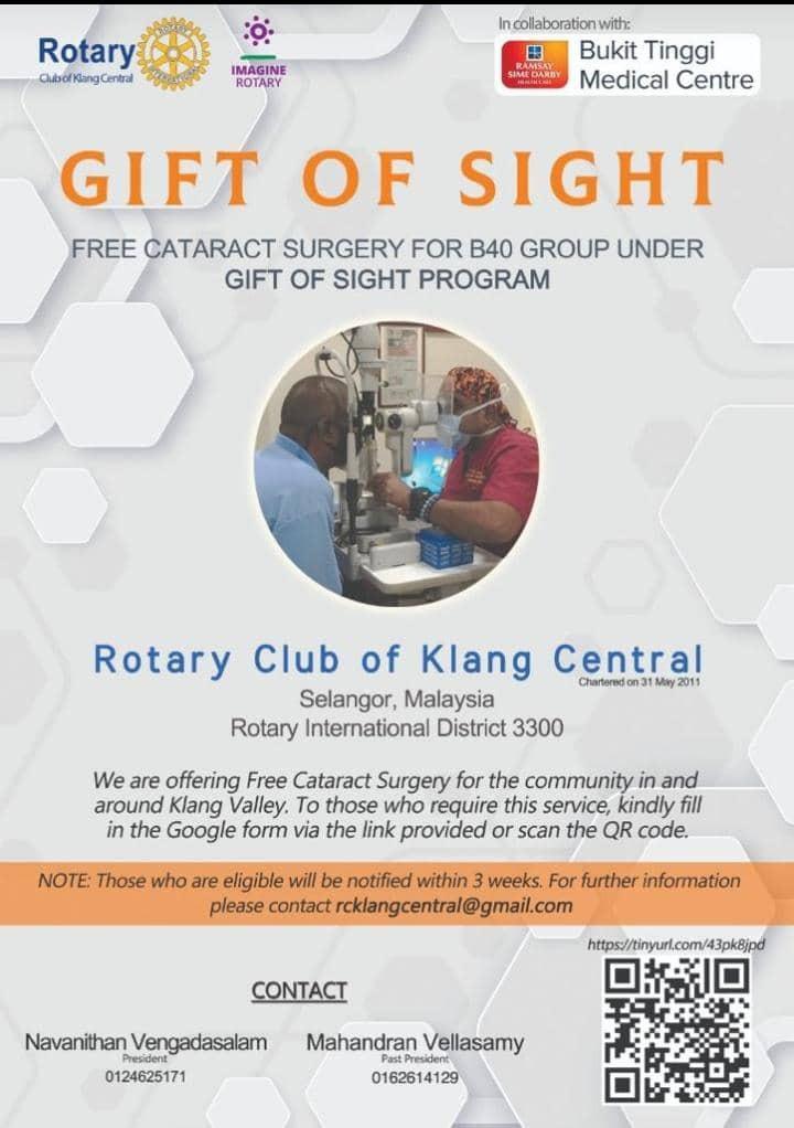 Rotary Club of Klang Central, in collaboration with Bukit Tinggi Medical Centre, are offering free cataract surgery for the B40 community in and around Klang Valley, under the Gift of Sight Programme.