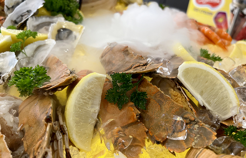 As you step into The Lodge, your eyes will be captivated by the beautifully arranged variety of seafood displayed in small boats.