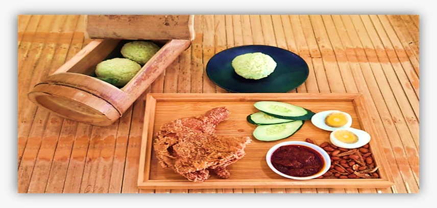 The Nasi Lemak Ayam Goreng arrives on a bamboo platter, showcasing fragrant Nasi Lemak Pandan, accompanied by a generous serving of Fried Chicken XL, Boiled egg, Anchovies, Peanuts, and a delightful sweet and slightly spicy sambal. It’s a hearty Malaysian staple, unpretentious and satisfying.