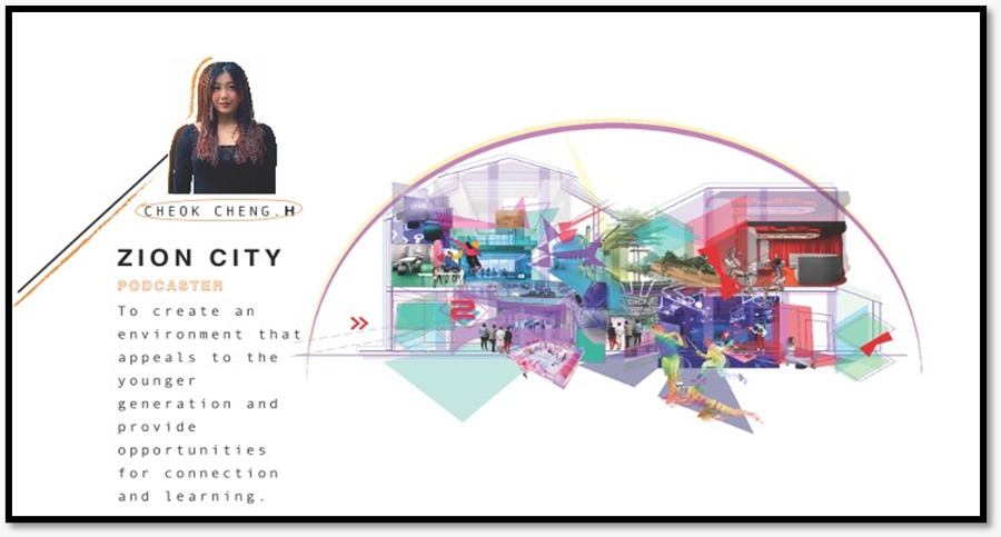 Zion City by Christine Cheok: Christine’s vision is “Zion City,” a space designed to attract the younger generation for work and living. It offers podcast and workshop-speaking platforms, fostering connections, learning, and self-expression.