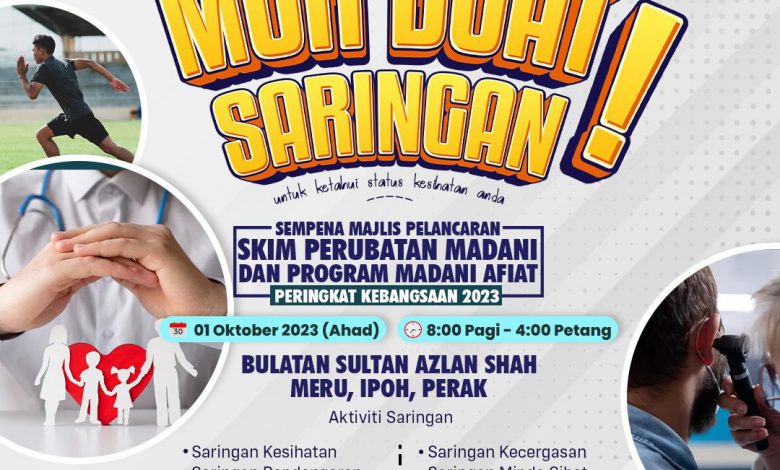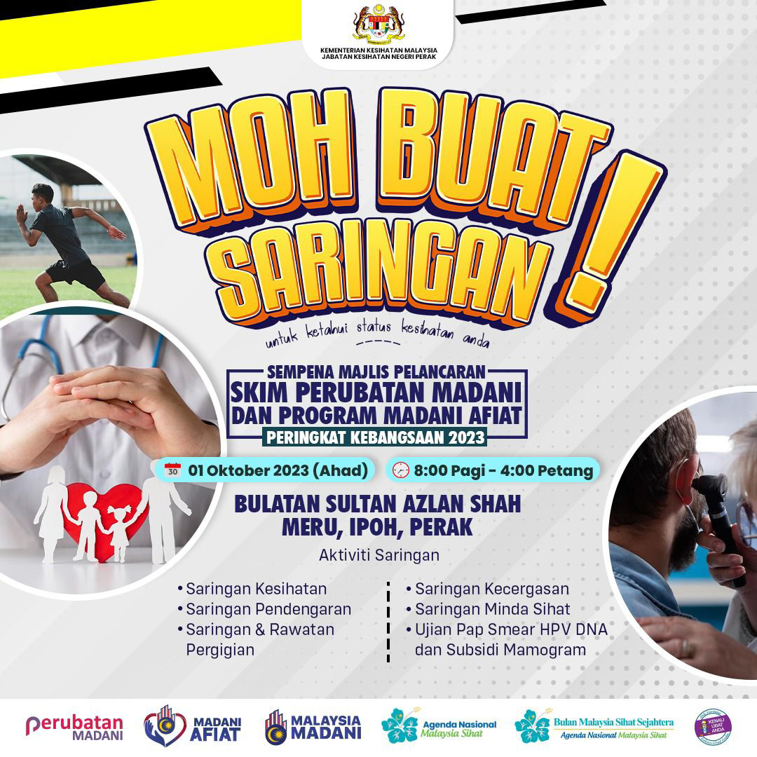 In conjunction with the Launch of the MADANI Medical Scheme and the MADANI Wellness Programme, National Level 2023, the Perak State Health Department (JKN) invites the public to undergo free health screenings.